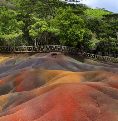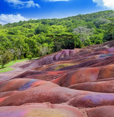 La tierra de los siete colores está compuesta por una fusión de colores puramente exóticos, -rojizo, marrón, violeta, esmeralda, azulado, púrpura y oro-, mostrando sus contrastes con definición y acogiendo a una dulce familia de tortugas terrestres. Mauricio es una isla ciertamente volcánica, estas dunas contienen lava fundida, fusiones de hierro y aluminio, lo que de manera impresionante produce que las arenas no se erosionen, se mantienen intactas incluso después de una gran tormenta.